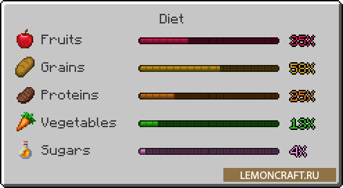 Мод на диету Diet делит в игре Майнкрафт все продукты на 5 категорий (фрукты, злаки, овощи, белки и сахар). В вашу задачу входит правильное распределение пищи при питании (соблюдение диеты). В результате вы сможете получить призовые очки здоровья и некоторые эффекты, которые вы сможете выбрать в настройках мода.